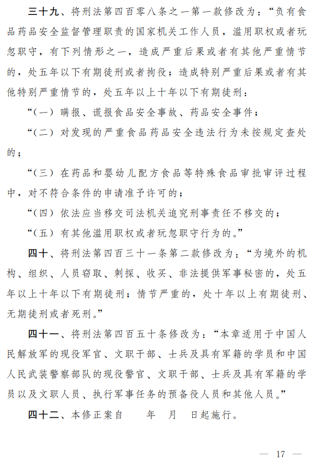 從二次審議稿內(nèi)容來看, 關(guān)于食品藥品監(jiān)管瀆職罪的規(guī)定與今年7月份的發(fā)布的草案相比 ,有了重大變化,取消了“未及時發(fā)現(xiàn)監(jiān)督管理區(qū)域內(nèi)重大食品藥品安全隱患的“的規(guī)定。草案內(nèi)容具體如下: