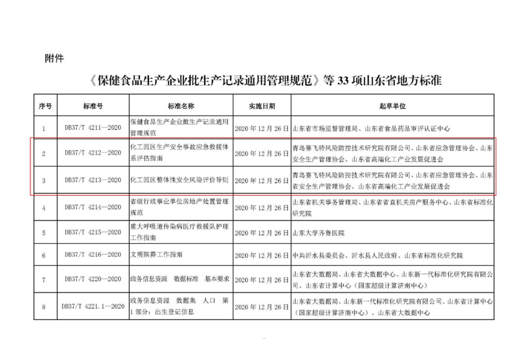 近日,山東省市場監(jiān)督管理局批準(zhǔn)發(fā)布了33項(xiàng)山東省地方標(biāo)準(zhǔn)。其中的《化工園區(qū)生產(chǎn)安全事故應(yīng)急救援體系評估指南》(DB37/T 4212-2020)、《化工園區(qū)整體性安全風(fēng)險(xiǎn)評價(jià)導(dǎo)則》(DB37/T 4213-2020)由青島賽飛特風(fēng)險(xiǎn)防控技術(shù)研究院有限公司、山東省應(yīng)急管理協(xié)會(huì)、山東省安全生產(chǎn)管理協(xié)會(huì)、山東省高端化工產(chǎn)業(yè)發(fā)展促進(jìn)會(huì)聯(lián)合起草,現(xiàn)分享給各位:
