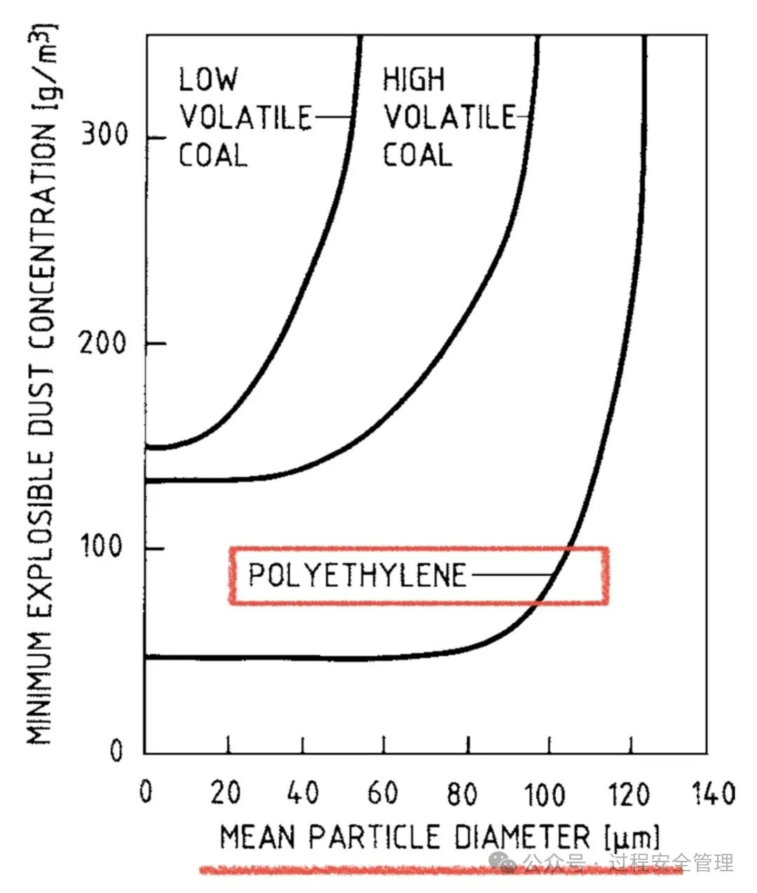 聚乙烯粉塵的粒徑小于90μm的情況下,最低爆炸濃度(MEC)大致為33g/m3,聚乙烯粉塵的粒徑大于120μm時(shí),最低爆炸濃度(MEC)急劇升高,粉塵爆炸的可能性大幅降低。如果聚乙烯粉塵云濃度大于30g/m3,存在極大的粉塵爆炸風(fēng)險(xiǎn)。