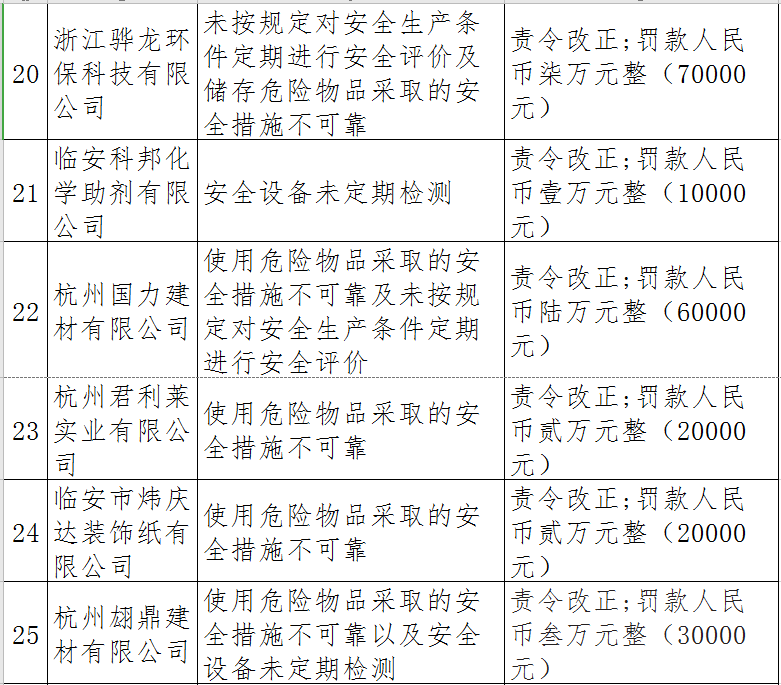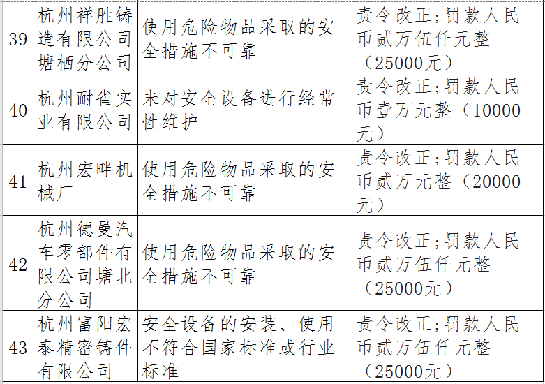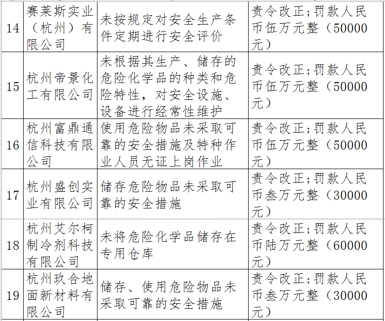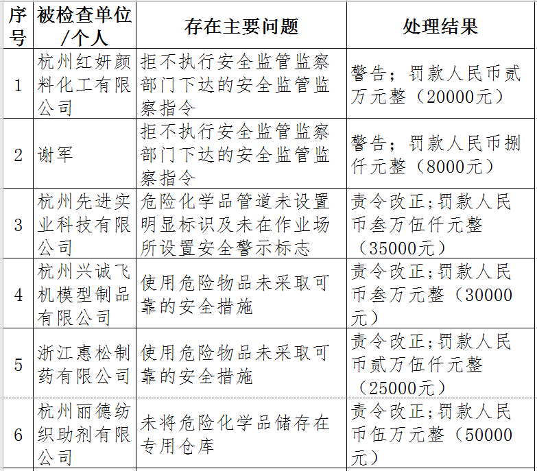 據(jù)了解,今年上半年,杭州市應(yīng)急管理局一手抓駐企復(fù)工復(fù)產(chǎn)、一手抓安全生產(chǎn),已完成年度執(zhí)法計劃、專項檢查、聯(lián)合執(zhí)法、信訪舉報核查等,并對檢查中發(fā)現(xiàn)的安全生產(chǎn)違法違規(guī)企業(yè)(個人)進(jìn)行了處罰?,F(xiàn)對52家被行政處罰的企業(yè)(個人)進(jìn)行曝光,希望各企業(yè)引以為戒!
