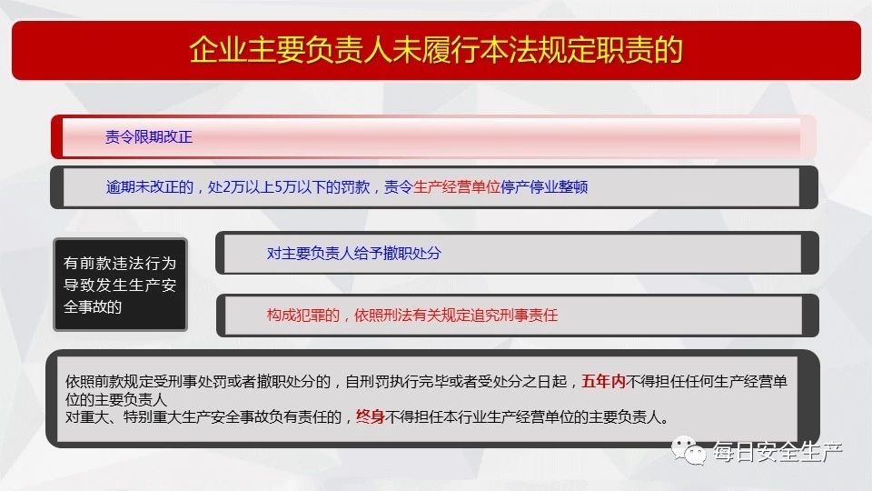 組織機構(gòu)和職責(zé) | 主要負責(zé)人未履行安全生產(chǎn)管理職責(zé)的 | 責(zé)令限期改正 | 對主要負責(zé)人處二萬元以上五萬元以下的罰款,責(zé)令生產(chǎn)經(jīng)營單位停產(chǎn)停業(yè)整頓。 |