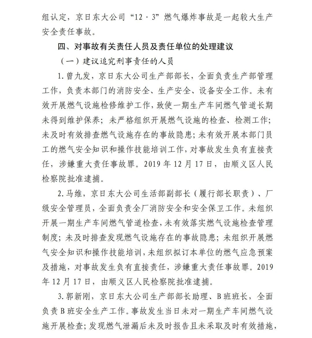 1.曾九發(fā),京日東大公司生產(chǎn)部部長,全面負(fù)責(zé)生產(chǎn)部管理工作,負(fù)責(zé)本部門的消防安全、生產(chǎn)安全、設(shè)備安全工作。未有效開展燃?xì)庠O(shè)施檢修維護(hù)工作,致使一期生產(chǎn)車間燃?xì)夤艿篱L期未得到維護(hù)保養(yǎng);未嚴(yán)格組織開展燃?xì)庠O(shè)施的檢查、檢測工作;未及時(shí)有效排查燃?xì)庠O(shè)施存在的事故隱患;未有效開展本部門員工的燃?xì)獍踩R和操作技能培訓(xùn)工作,對事故發(fā)生負(fù)有直接責(zé)任,涉嫌重大責(zé)任事故罪。2019 年 12 月 17 日,由順義區(qū)人民 檢察院批準(zhǔn)逮捕。