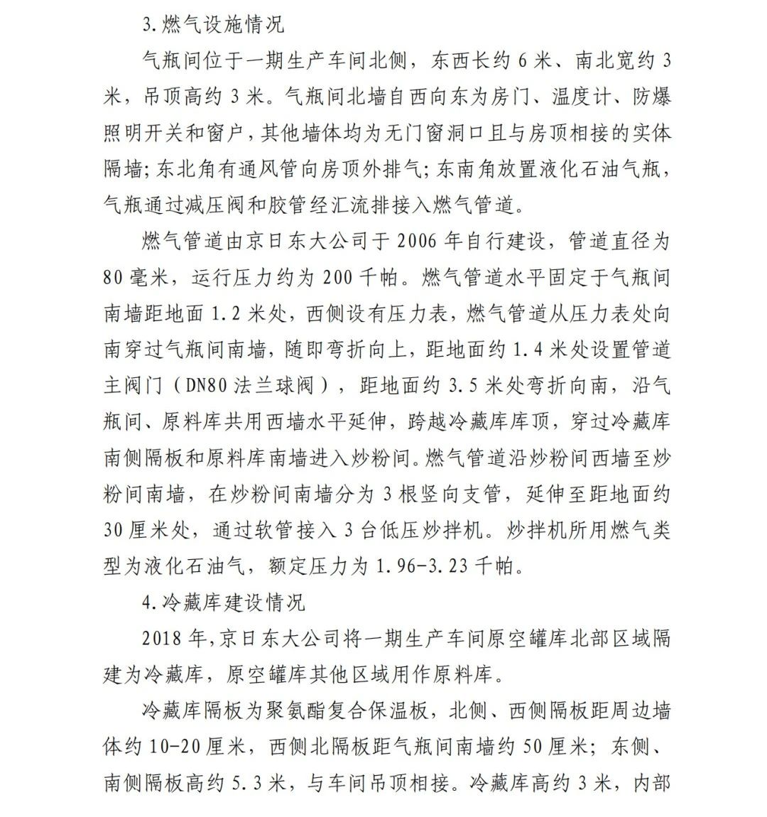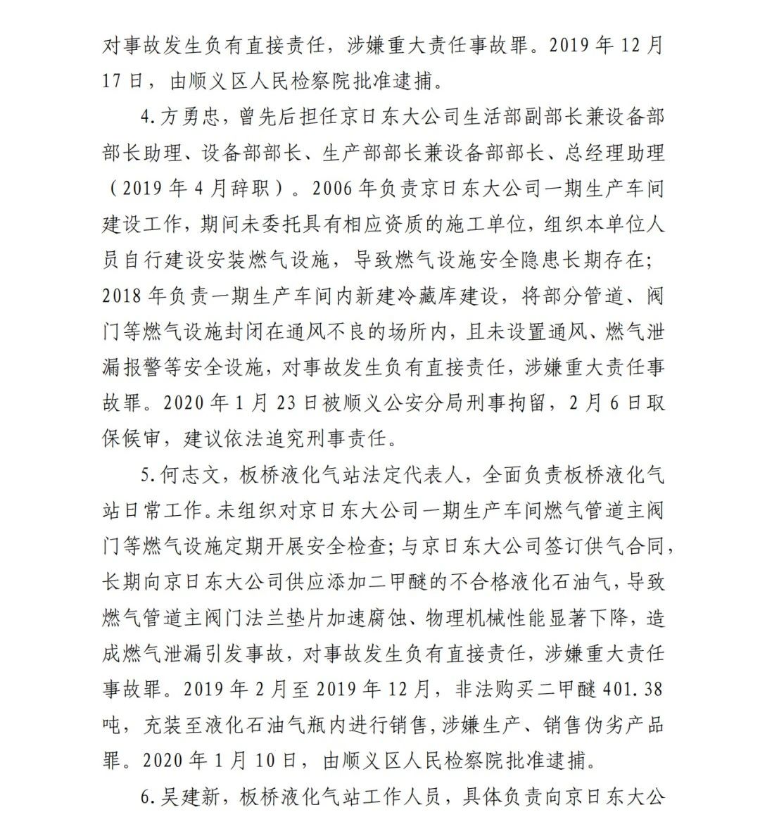4.方勇忠,曾先后擔(dān)任京日東大公司生活部副部長兼設(shè)備部部長助理、設(shè)備部部長、生產(chǎn)部部長兼設(shè)備部部長、總經(jīng)理助理(2019年4月辭職)。2006年負(fù)責(zé)京日東大公司一期生產(chǎn)車間建設(shè)工作,期間未委托具有相應(yīng)資質(zhì)的施工單位,組織本單位人員自行建設(shè)安裝燃?xì)庠O(shè)施,導(dǎo)致燃?xì)庠O(shè)施安全隱患長期存在;2018 年負(fù)責(zé)一期生產(chǎn)車間內(nèi)新建冷藏庫建設(shè),將部分管道、閥門等燃?xì)庠O(shè)施封閉在通風(fēng)不良的場所內(nèi),且未設(shè)置通風(fēng)、燃?xì)庑孤﹫?bào)警等安全設(shè)施,對事故發(fā)生負(fù)有直接責(zé)任,涉嫌重大責(zé)任事 故罪。2020 年 1 月 23 日被順義公安分局刑事拘留,2 月 6 日取 保候?qū)彛ㄗh依法追究刑事責(zé)任。