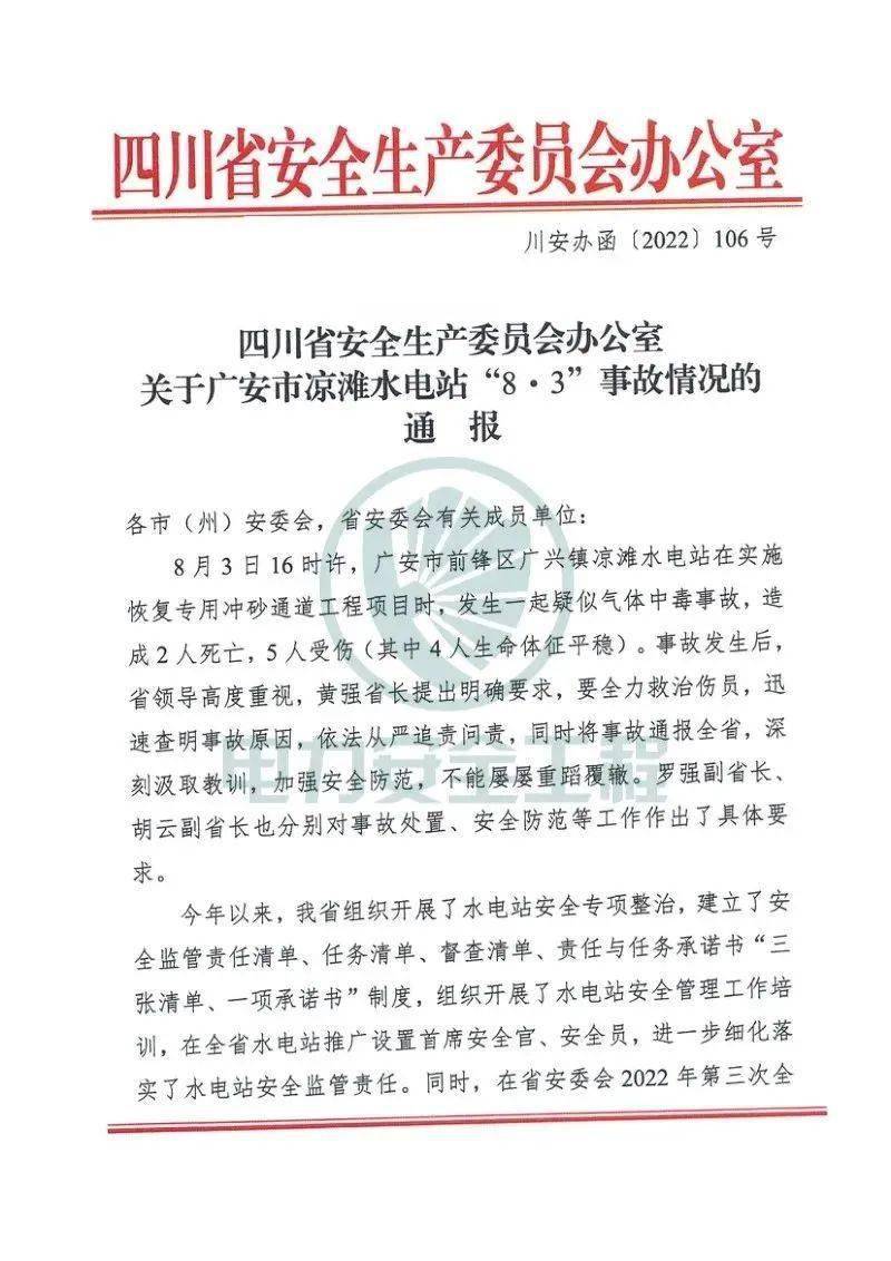 2022年8月3日,四川省廣安市前鋒區(qū)廣興鎮(zhèn)涼灘水電站在實(shí)施恢復(fù)專用沖砂通道工程項(xiàng)目過程中,發(fā)生中毒事故,造成3人死亡,4人受傷。